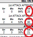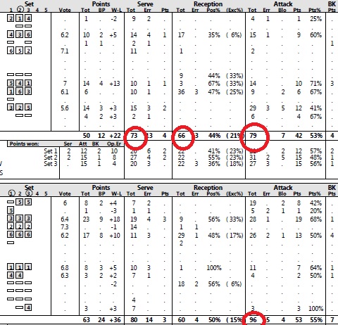 The four numbers that should jump out are the number of attacks from each team, the number of serves and the number of receptions. Volleyball is spiking. It always has been and it always will be. It is the preeminent skill in volleyball. And it is the thing that you do the most. More than service and reception.