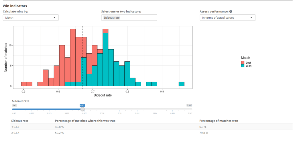 The Plus Liga season is plodding along between postponements and I have been looking at some statistics along the way. You can find all of the previous posts here. Our favourite Science Untangled report app has a new feature that you might not have come across yet. The Win Indicators tab will take our seasons stats and find the level that will give us a certain rate of winning. For example, in the chart below we see the sideout rate charted with winning and losing matches. By setting a particular sideout rate on the sliding scale we can find our likelihood of winning. It turns out that in the current season a sideout rate of 67% ensures that we will win 80% of our matches. Which seems like a pretty good target.