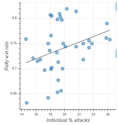 Wassim Ben-Tara receives the most at 37.6%. Looking at Rally Win Rate (our best measure of attack quality) Ben-Tara ranks 5th, and 3rd place Jimenez is 6th. The most effective opposite is Łukasz Kaczmarek, attacks barely 27% of his teams attempts. He is such an outlier though that if you remove him from the list, distribution and effectiveness seem to be more or less independent. Included are 21 opposites who have attacked at least 100 balls.