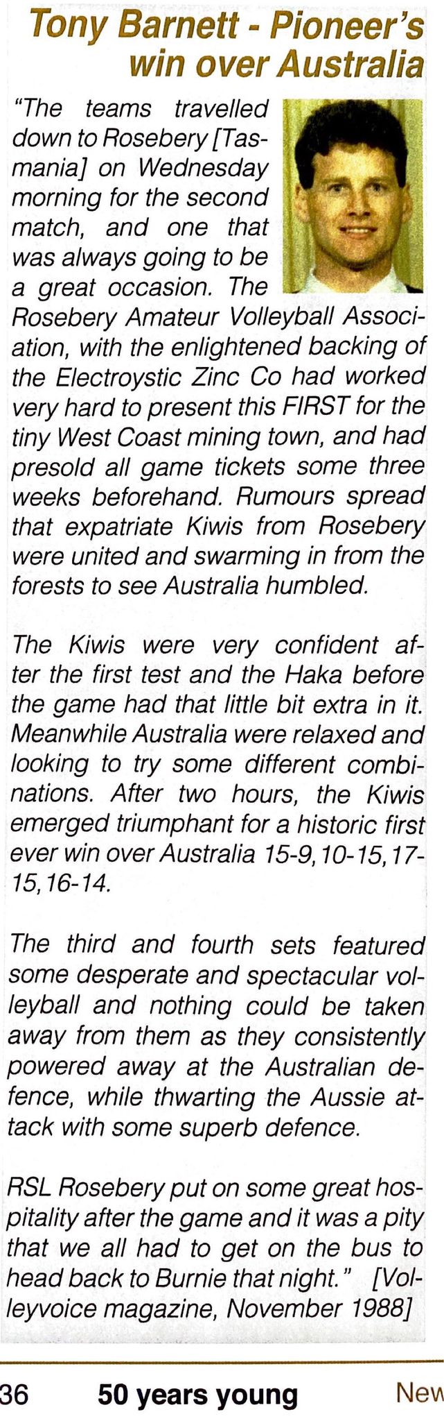 For reasons that I am not 100% clear about the already poor history of Australian volleyball, especially of the National Teams prior to the inauguration of the AIS program, has a massive hole in 1988. There are some matches that I know existed but were never recorded, such as the 1988 Bicentennial Cup, but I recently learned of an event that I didn’t even know about, the 1988 Trans Tasman Trophy. As far as I can put together, a Hungarian team was due to tour Australia but cancelled at the last minute. The AVF contacted New Zealand to fill the void. The 10 day time period was too short to put together their full National Team, but the Pioneer Club of Christchurch offered to fill the void, with the addition of two other players. Four matches were played in Tasmania and Victoria. New Zealand won the second match of the tour in Rosebery. According to the New Zealand press report linked below it was the first New Zealand victory over Australia for fifteen years. According to official (admittedly incomplete) records, it was actually New Zealand’s first every victory over Australia in an international match.