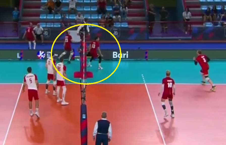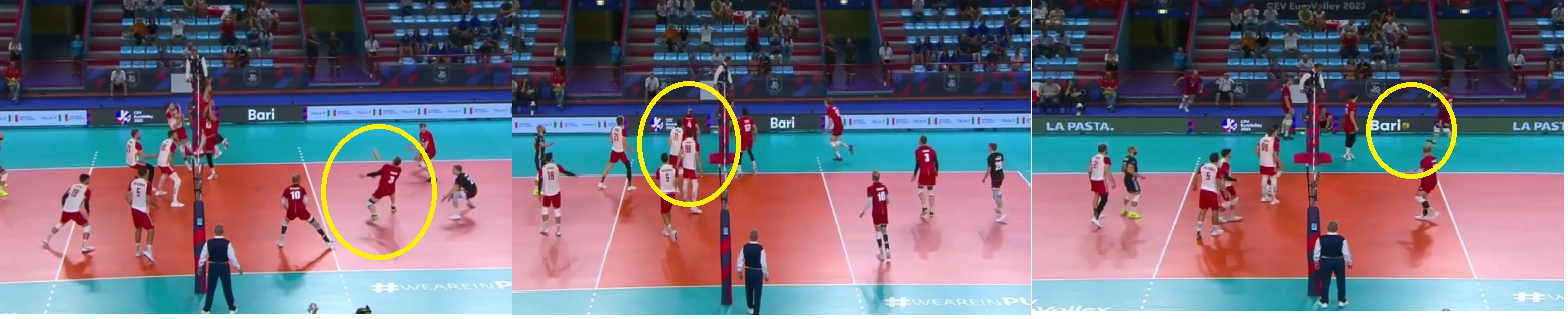 Thirteen years ago, I wrote about all the examples of running in volleyball that are functionally pointless, and yet somehow always praised as valuable activity. To avoid repeating myself, have a read of it here. The running = activity seed has taken root so strongly in volleyball that to try telling a player that they should run less and think more creates a fairly large cognitive dissonance. But already I digress. This current European Championships has provided plenty of examples of pointless activity, but this one jumped out at me. I can’t post the video because it is copyrighted, but here are a couple of screenshots.