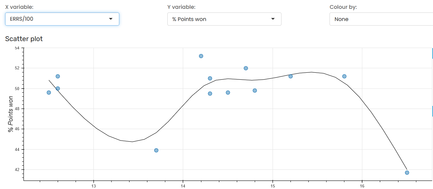 I have thought more about that concept in recent times, partly to try to explain why in (men’s) volleyball errors don’t have much relationship to winning and losing. I noticed that while total errors (for the record, opponent aces are NOT reception errors) were unrelated to winning, total errors that were not service errors seem to explain something (see charts below from 2021 Olympics). How can that be? An error is an error. One point is one point. Surely. But if we have ever watched any match of any sport we know that not all points are equal and not all errors are equal. So I came up with the idea of the opportunity cost of errors. In men’s volleyball, the chance of winning a point on serve is relatively small. So an error loses us only ‘relatively small’ chance of winning a point. An attack error on the other hand costs us a lot more as the chance of winning a point if an attack is in the court is relatively high. The time of the set also changes the cost of error. We have already studied that winning / losing points at different parts of the set have different impacts on win probability. So it seems the approach might be logical. We might even be able to put number values to different kinds of errors using expected values from our league datasets.