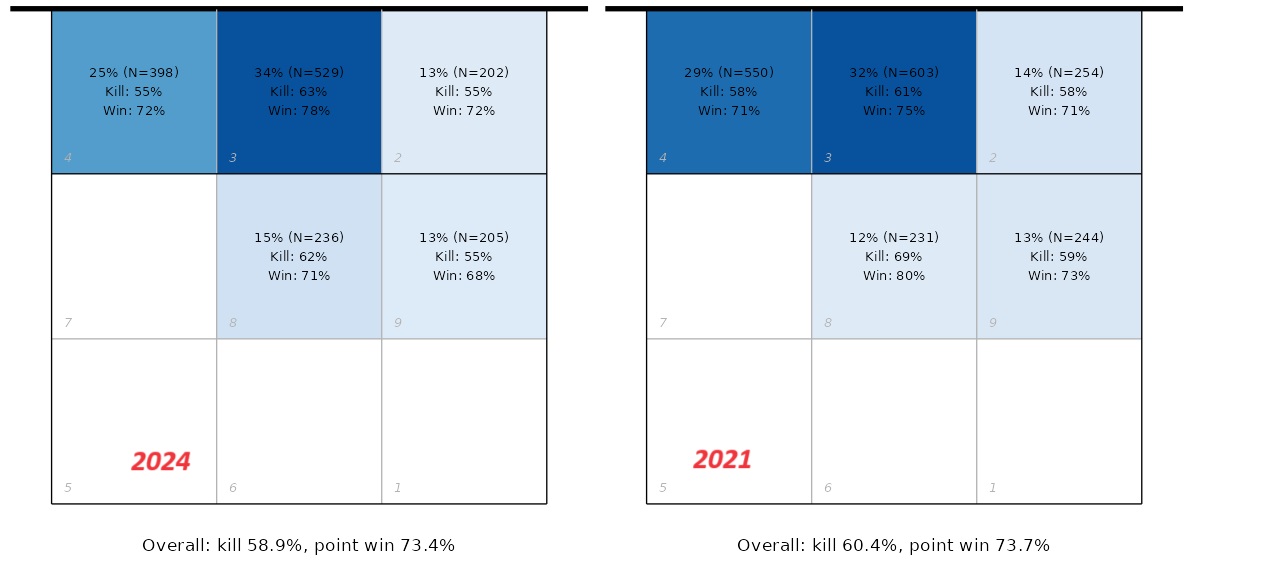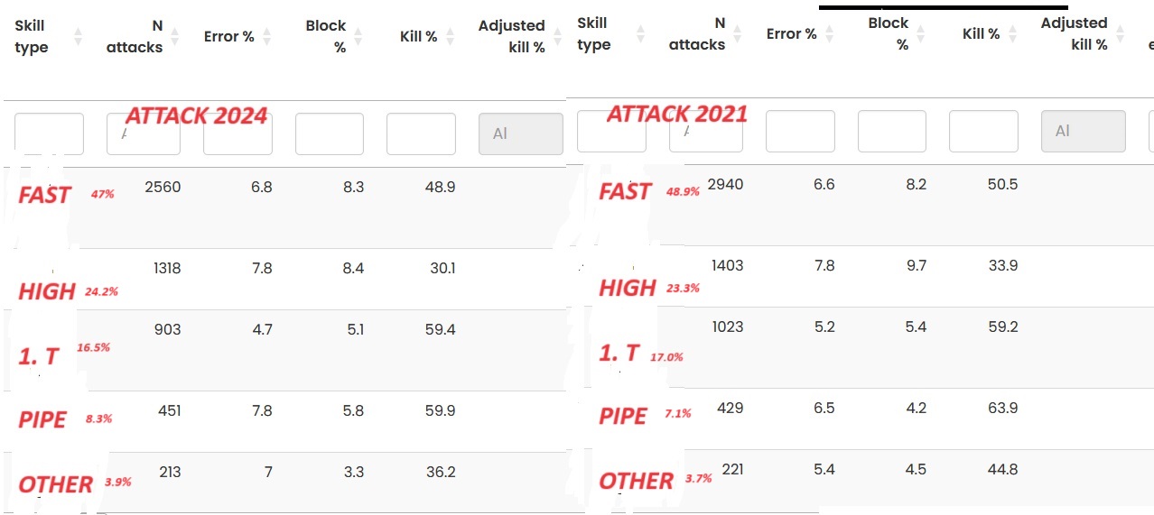 Above is the tournament distribution from good reception. In 2024, 49% through the middle of the court v 44% in 2021. We cannot say that offences are more conservative. First tempo was set more often, and with more effect. Position 2 and 4 scored less often directly but were overall effective in scoring points. Position 6 and 1 however were must less effective.